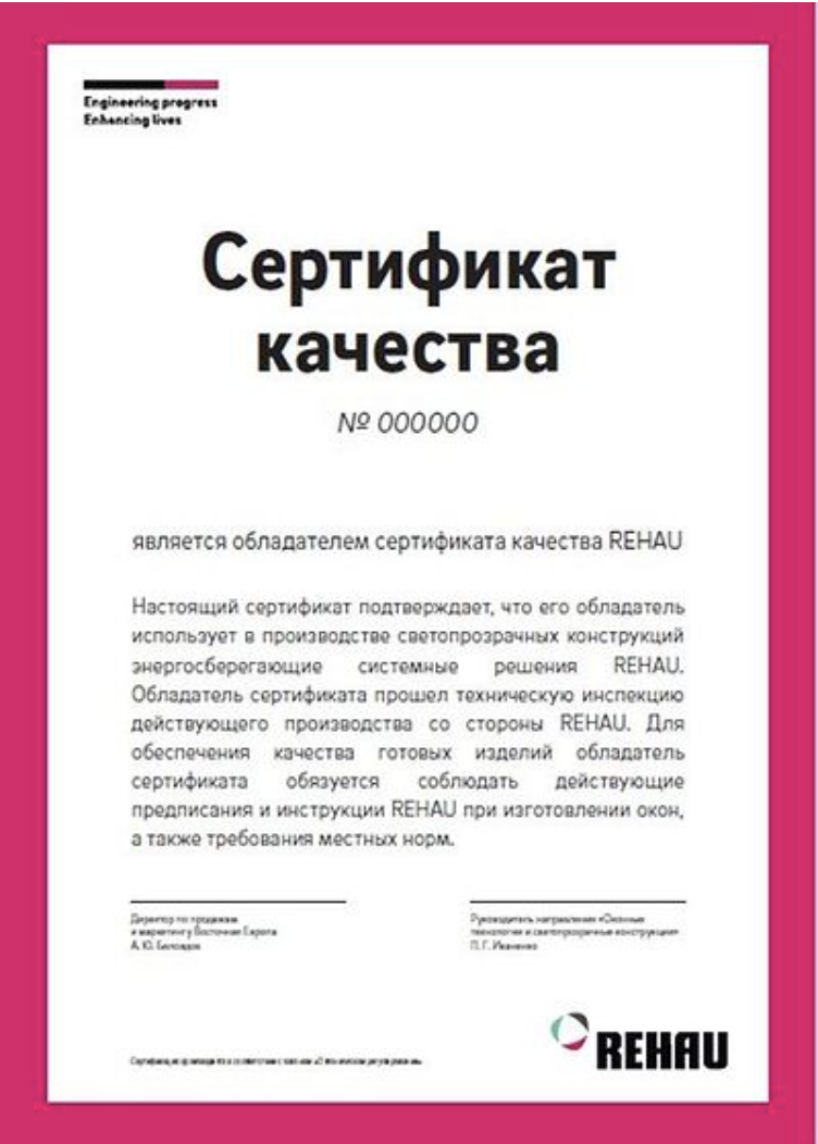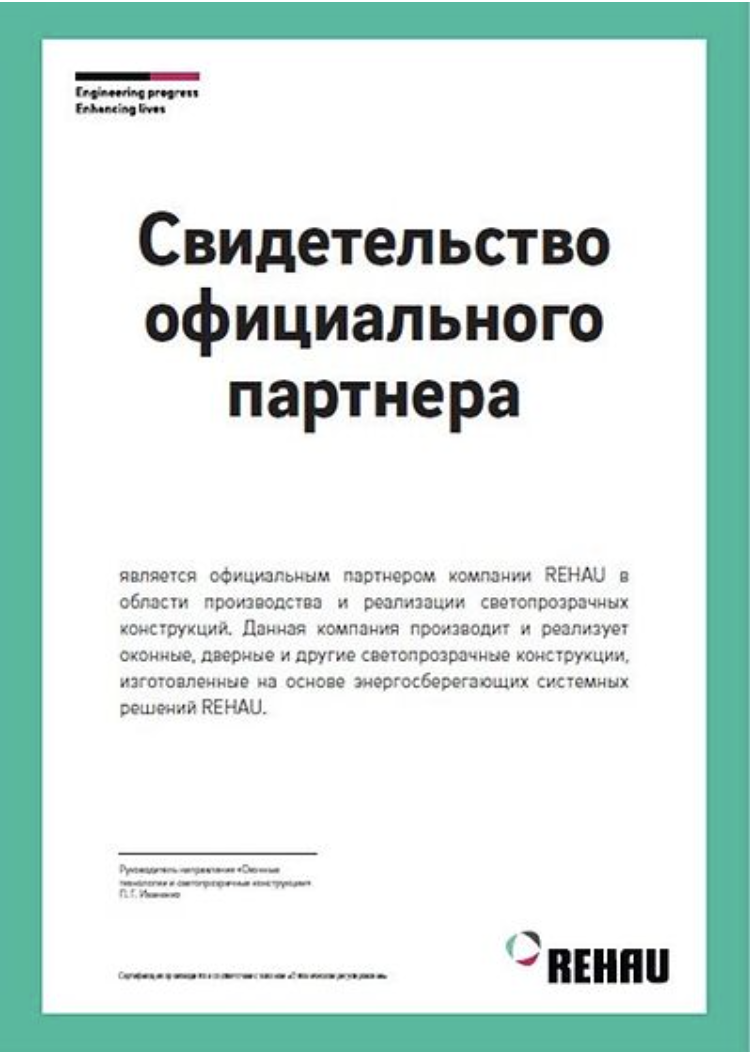 Партнеры, соблюдающие технологии производства и использующие оригинальную продукцию и комплектующие REHAU, проходят ежегодную аттестацию, свидетельством чему являются Сертификат качества, Свидетельство официального партнера, Сертификат «Салон энергосберегающих окон REHAU»
